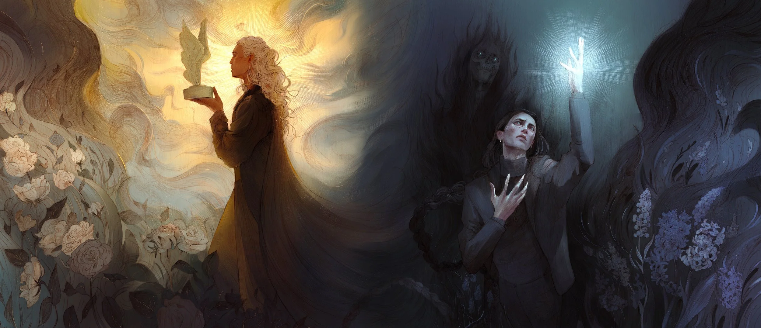 With this dust jacket concept, I especially wanted to highlight the differences between our two main characters, Drake (right/front cover) and Hyakinthos (left/back cover). The primary way that I went about doing so was by depicting two different times of day: here Drake is shown surrounded by the oppressive gloom and shadows of nighttime, while Hyakinthos strolls through a glistening rose garden and cloudscape at dawn. Roses and hyacinths also feature prominently across the dust jacket side-flaps, symbolically representing each opposing character.